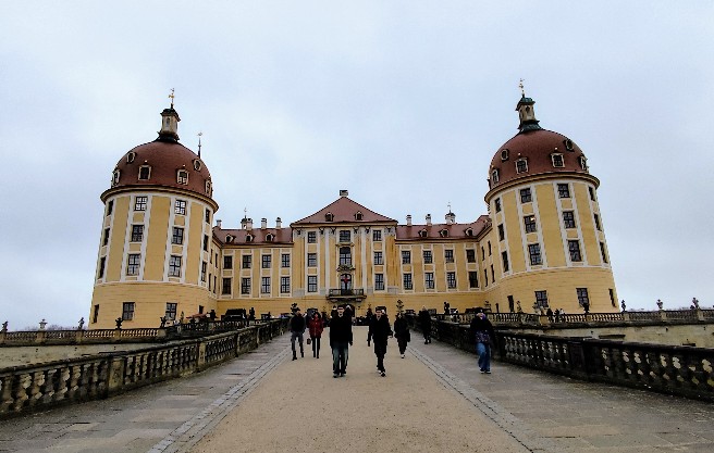 Autobus vyrazil za sychravého počasí z úpického náměstí přesně v šest hodin ráno, cesta ubíhala celkem bez problémů. Kolem půl jedenácté jsme vystoupili u „Popelčina“ zámku Moritzburg, který známe ze slavné filmové pohádky. Obešli jsme barokní zámeček, stoupali schodištěm, kudy Popelka prchala z plesu, a hledali na něm její střevíček, který si jedna naše školní Popelka po chvilce přemlouvání vyzkoušela. A pak se dobrovolně přidal i jeden Popelák, jemuž bota spíše nadměrné velikosti padla o poznání lépe. Z terasy jsme – stejně jako ve filmu paní Šafránková – „zamrzlým“ okénkem nahlédli do plesového sálu, a to zrovna ve chvíli, kdy loutkového prince zvedá ve své náruči Droběna tančící v rudých šatech. Při cestě na toalety jsme si prohléhli nádobí a porcelán ze zámecké kuchyně vystavené v přízemí a zahlédli i prince na bílém koni ve filmovém kostýmu. Před zámkem jsme se vyfotili a v informačním centru nakoupili suvenýry.